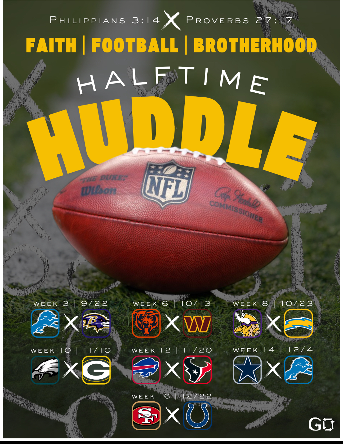 This life group starts every fall just before the NFL season begins. We gather for fellowship, fun, and build our teams. Then throughout the season we meet for different Monday Night and Thursday Night Games for something we call Halftime Huddle. FAITH, FOOTBALL, BROTHERHOOD. If you are interested contact Christian Hunt 217-497-0024.